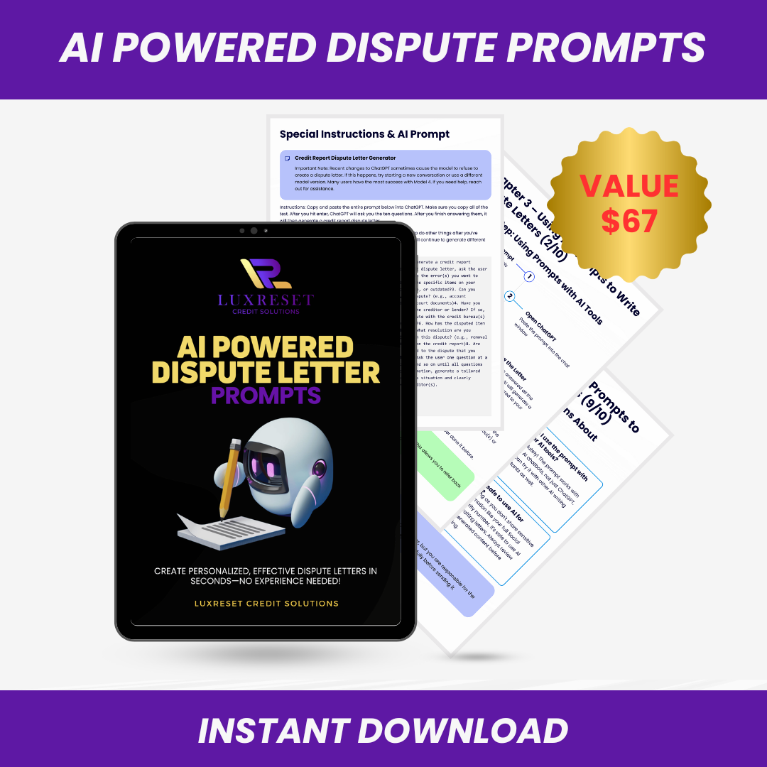 • 2. AI Powered Dispute Letter Prompts: Harness the power of Artificial Intelligence to generate professional, effective dispute letters in seconds. No experience needed!