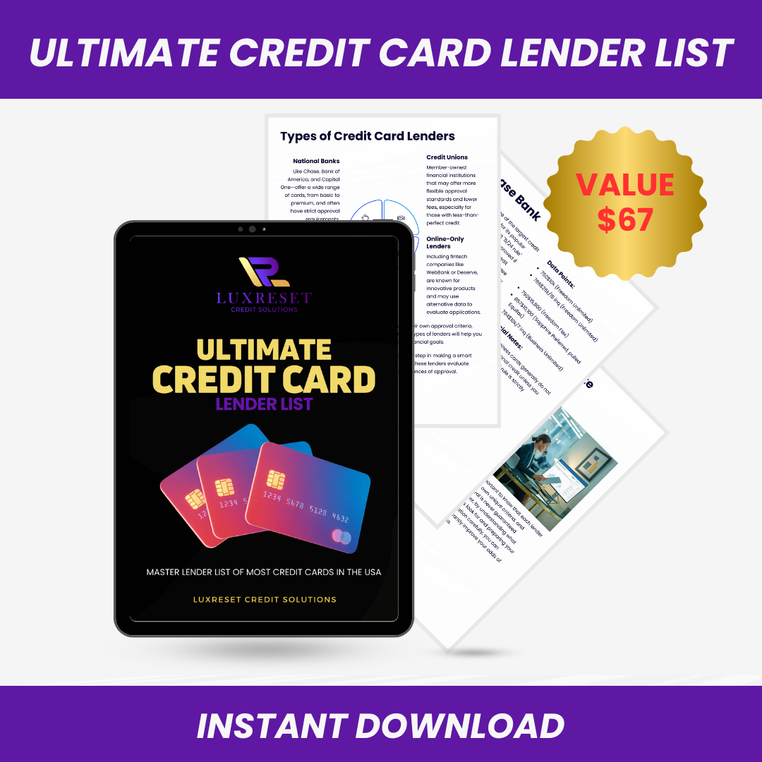 • 4. Ultimate Credit Card Lender List: Stop guessing and start getting approved. This master list reveals which credit bureau lenders pull from, the scores you need, and real approval data before you apply.