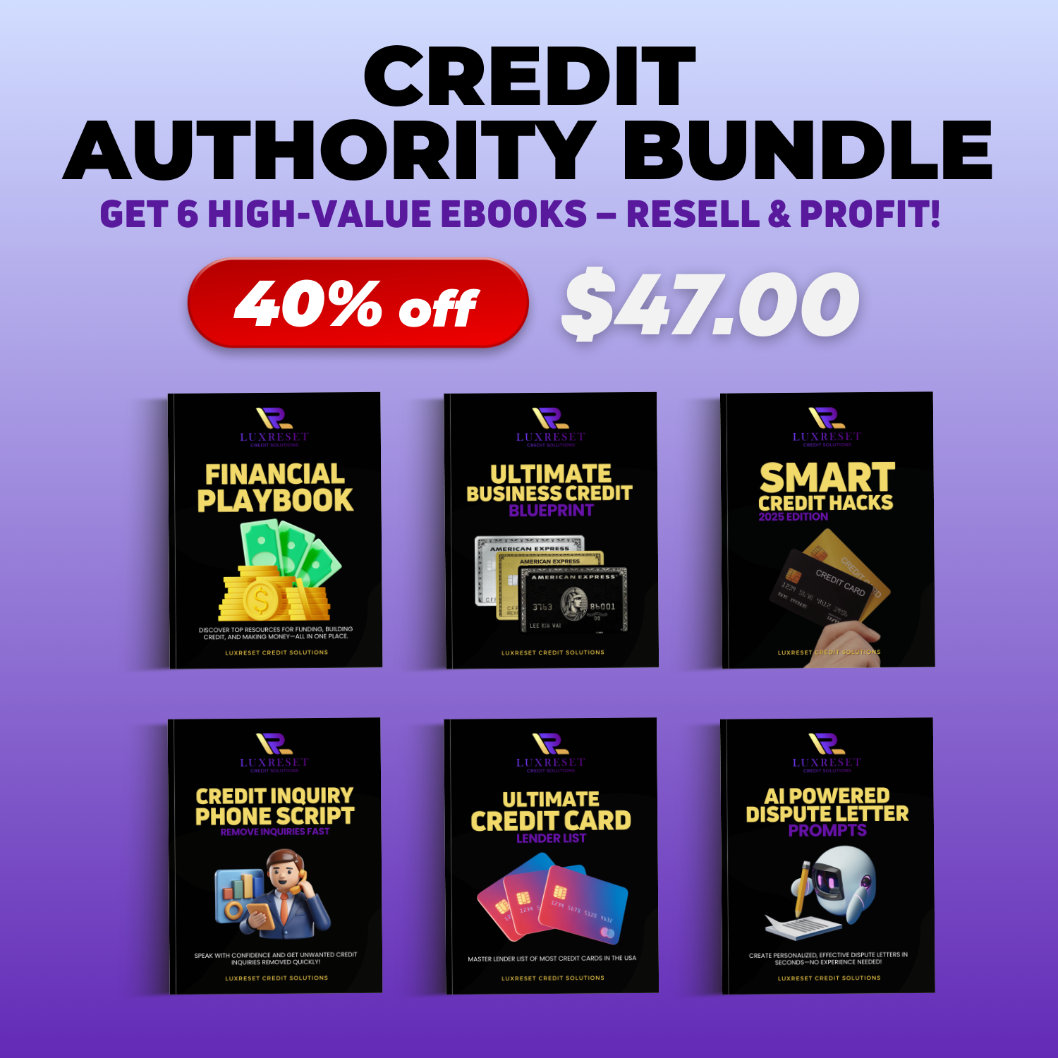 Gain complete mastery over your financial future with the Credit Authority Bundle. This exclusive deal includes 6 premium ebooks covering everything from AI-powered credit repair to building business credit and securing funding. Plus, with full resell rights included, you can learn from these guides and sell them for 100% profit. Get the ultimate credit library at 40% off!.